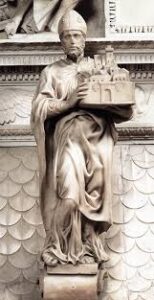 Formando parte del Arca de Santo Domingo, esta Obra representa a San Petronio, obispo y patrono de Bolonia, Esculpida en Mármol, la estatua de 64 cms. muestra al santo en el momento justo de dar un paso al frente, pareciése que esta Obra se encuentra dividida en 2 partes: la superior que muestra quietud y majestuosidad, y la inferior en donde se presenta tensión dinámica y aparente movimiento. Los ropajes del santo son extraordinariamente esculpidos con grandes espacios o huecos en donde se despliegan los contrastes de luces y sombras.